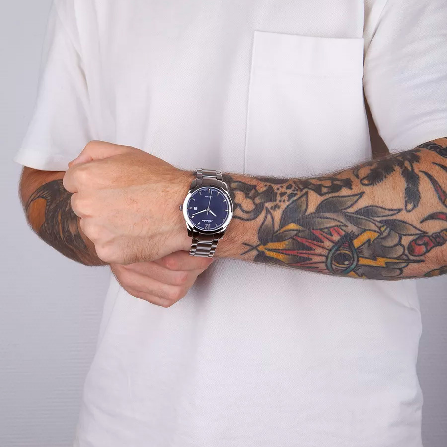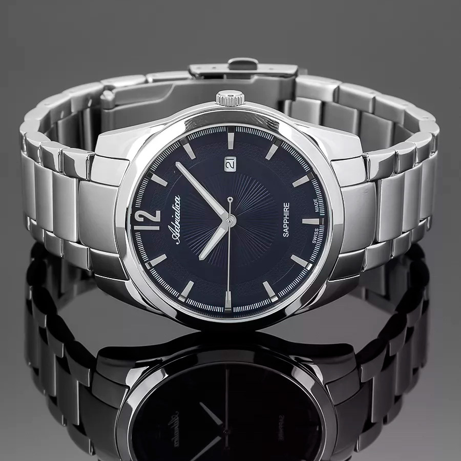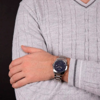 Корпус: Круглый корпус выполнен из полированной нержавеющей стали. Синий циферблат с узором гильоше. Накладные часовые индексы и стрелки выполнены из стали. Стрелки с покрытием SuperLuminova, которое обеспечивает подсветку в темное время суток. Сапфировое стекло устойчивое к возникновению царапин. Диаметр корпуса составляет 45 мм, толщина 10 мм. Водостойкость WR 50 (мытье рук, дождь).