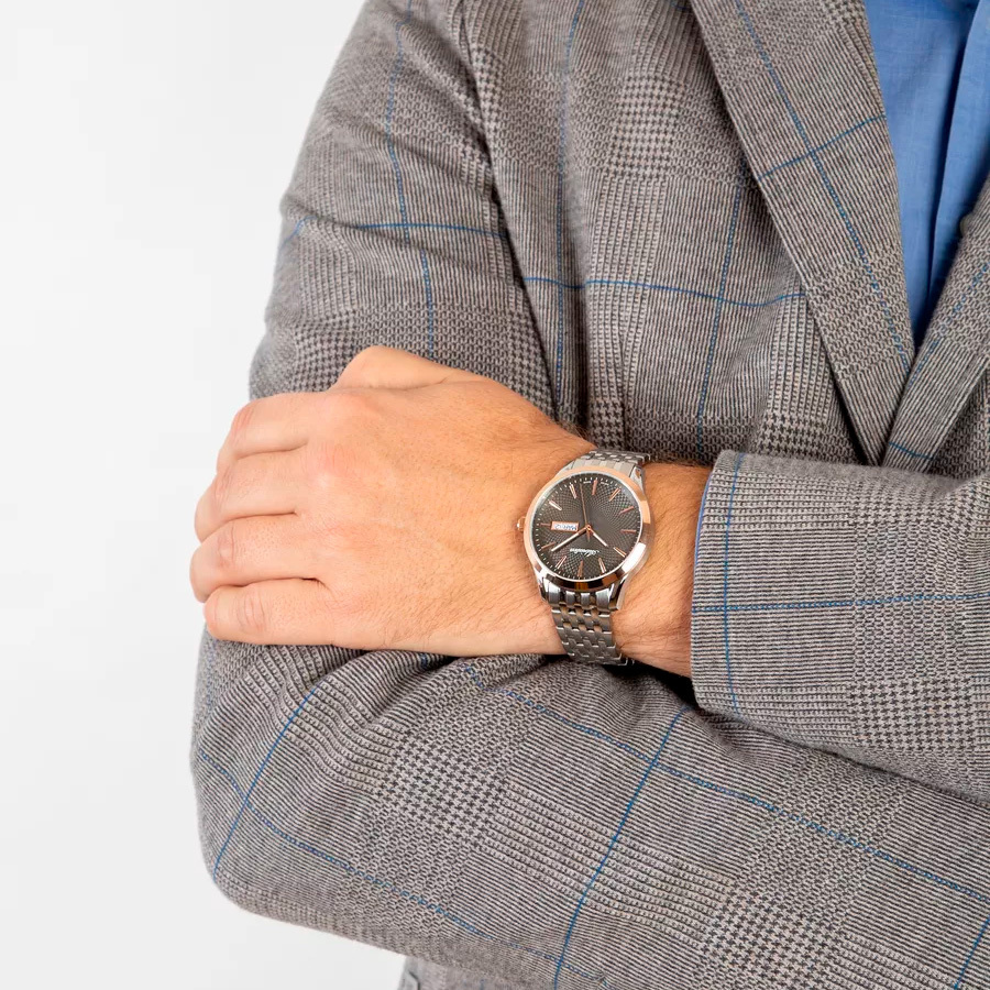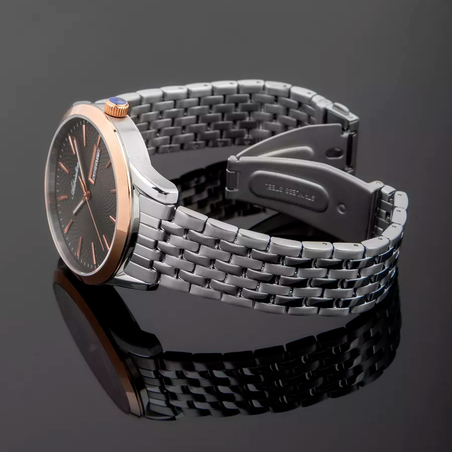 Ремешок: Браслет выполнен из высококачественной стали с повышенной устойчивостью к коррозии, поверхности с матовой шлифовкой – сатинированием и полировкой до зеркального блеска с раскладывающейся застежкой и дополнительной фиксацией.