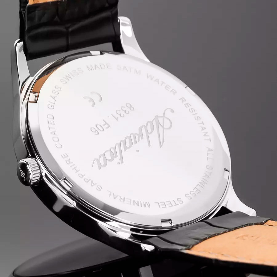 Корпус: Круглый корпус выполнен из полированной нержавеющей стали. Светлый циферблат. Накладные часовые индексы выполнены из стали. Стрелки с покрытием SuperLuminova, которое обеспечивает подсветку в темное время суток. Минеральное стекло. Диаметр корпуса составляет 42 мм, толщина 10 мм. Водостойкость WR 50 (мытье рук, дождь).