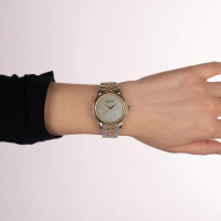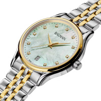 Корпус: Корпус из нержавеющей стали c частичным PVD - покрытием желтого золота, поверхность с полировкой до зеркального блеска. Зеленый перламутровый циферблат украшен 11 бриллиантами Top Wesselton VS-SI общим весом 0,041 карата. Часовые индексы и стрелки выполнены из стали с позолотой. Сапфировое стекло, устойчивое к появлению царапин, обладающее высокой прозрачностью. Диаметр корпуса составляет 32 мм. Водонепроницаемость: 30 м.