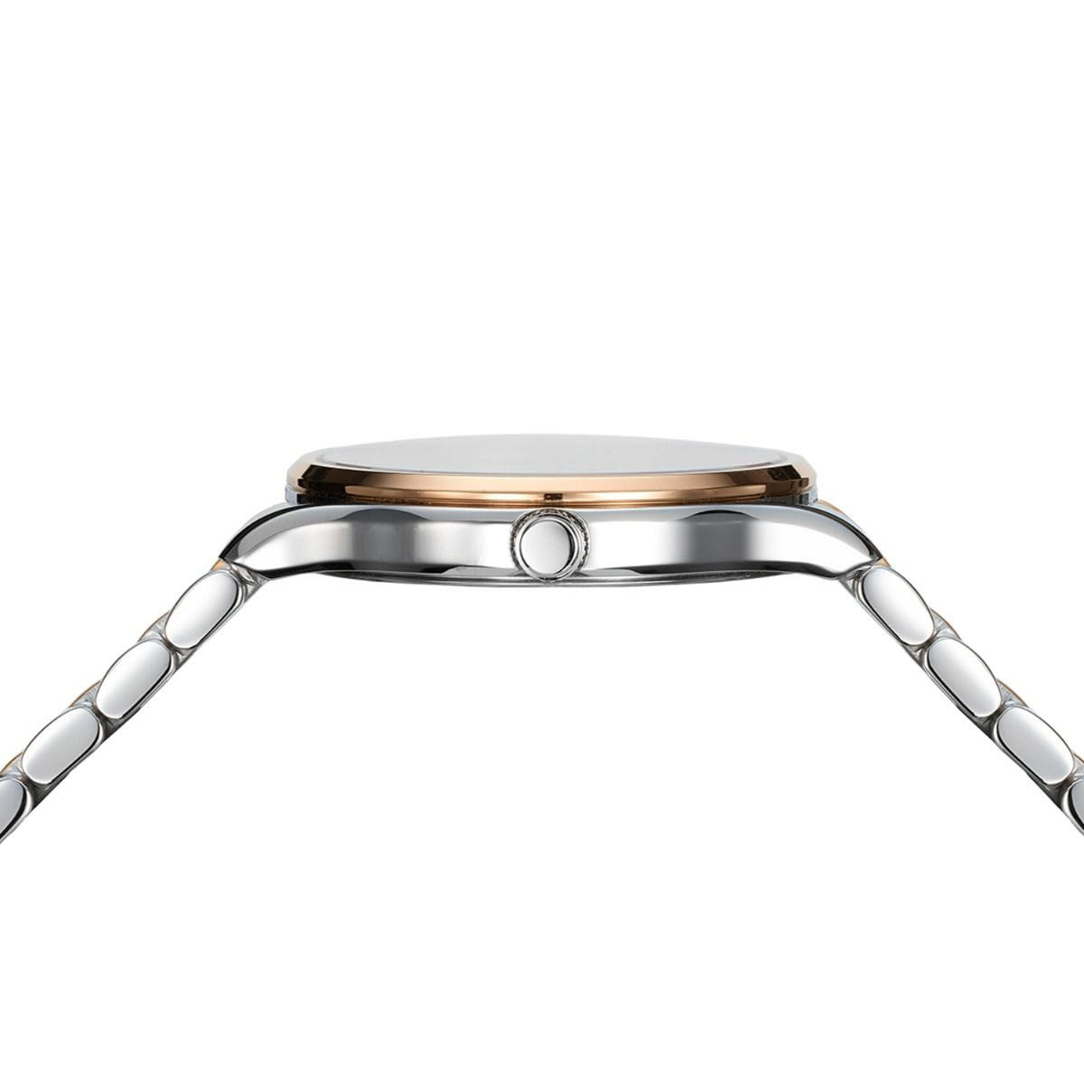 Корпус: Корпус из нержавеющей стали c частичным PVD - покрытием розового золота, поверхность с полировкой до зеркального блеска. Белый перламутровый циферблат украшен 11 бриллиантами Top Wesselton VS-SI общим весом 0,041 карата. Часовые индексы и стрелки выполнены из стали с позолотой. Сапфировое стекло, устойчивое к появлению царапин, обладающее высокой прозрачностью. Диаметр корпуса составляет 32 мм. Водонепроницаемость: 30 м.