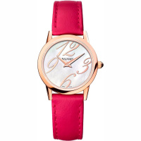 Корпус: Нержавеющая сталь с PVD - покрытием цвета розового золота. Циферблат перламутровый с позолоченными стрелкамии и часовыми индексами. Циферблат защищен высокопрочным сапфировым стеклом. Заводная головка украшена камнем в форме кабошона. Диаметр: 31 мм. Водостойкость: 50 м.