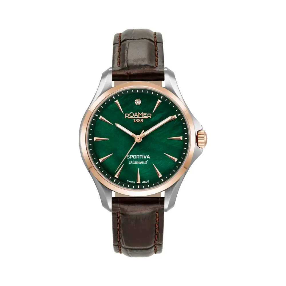 Корпус: Корпус выполнен из высококачественной нержавеющей стали 316L с полировкой и матовой шлифовкой - сатинированием с частичным IP покрытием. Перламутровый циферблат зелёного цвета декорирован 1 бриллиантом, золотистые стрелки и часовые индексы. Стрелки с люминесцентным покрытием для оптимальной разборчивости в условиях низкой освещенности. Сапфировое стекло с антибликовым покрытием. Диаметр: 36 мм. Водозащита: 50 м.