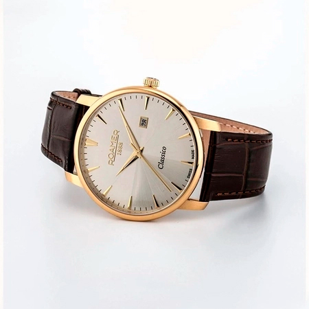 Корпус: Высококачественная нержавеющая сталь, марки 316L с IP покрытием из жёлтого золота. Металлик циферблат. Позолоченные стрелки и часовые индексы. Сапфировое стекло с антибликовым покрытием. Рифлёная заводная головка с логотипом марки «Roamer». Диаметр: 40 мм. Водонепроницаемость: 30 м.