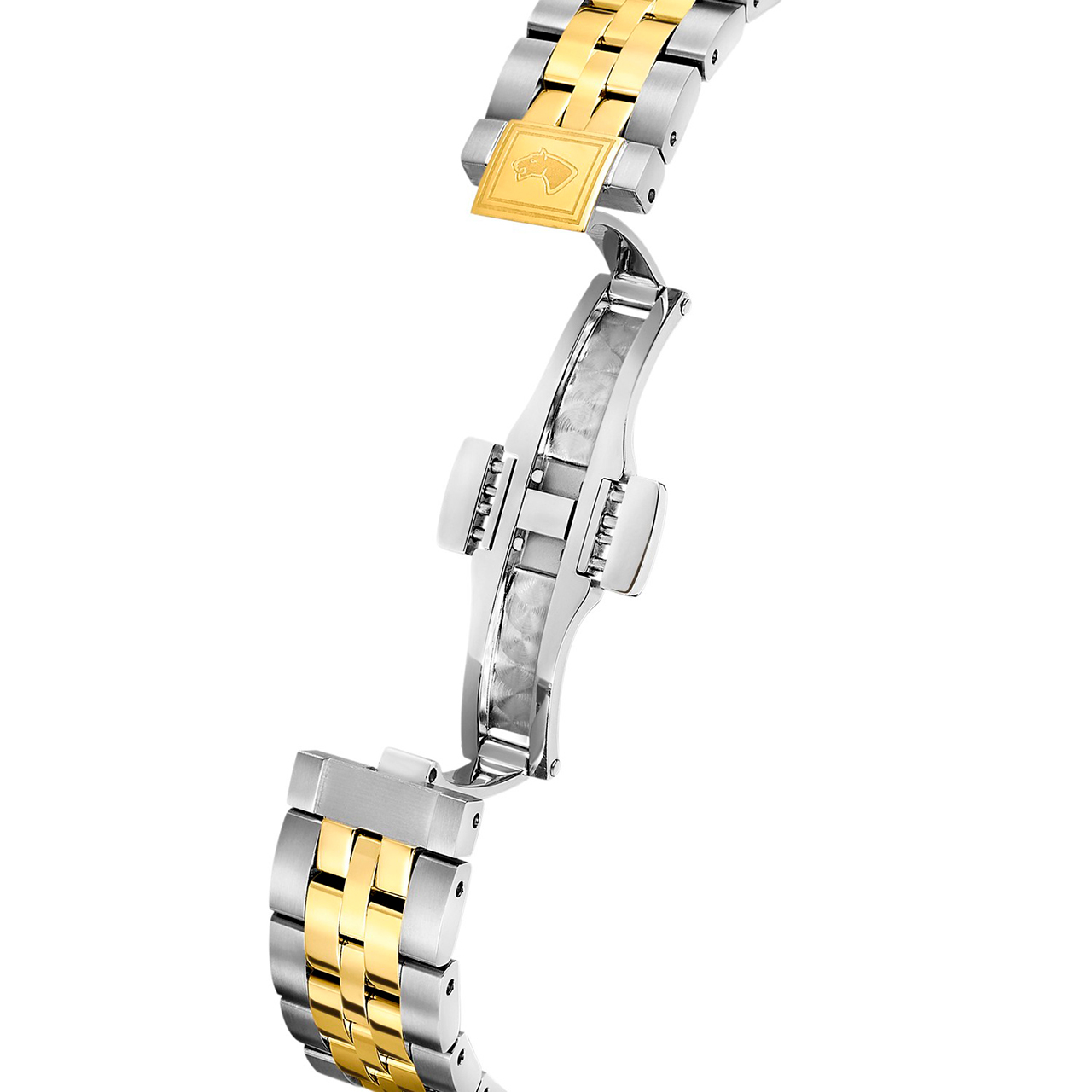 Ремешок: Интегрированный браслет на 5 звеньев с раскладывающейся застежкой-бабочкой. Частичное PVD-покрытие цвета желтого золота.