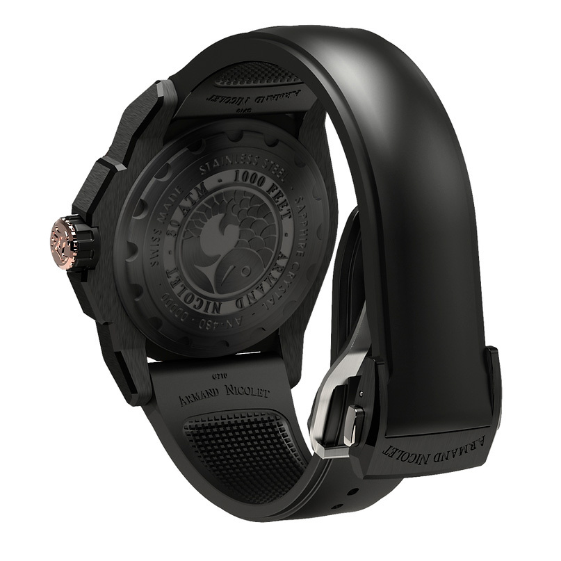 Корпус: Корпус из нержавеющей стали с DLC - покрытием чёрного цвета. Вращающийся керамический безель. Чёрный циферблат с золотистыми стрелками и часовыми индексами. Светонакопительный состав на стрелках и часовых индексах. Сапфировое стекло с антибликовым покрытием. Заводная головка с защитой. Завинчивающаяся задняя крышка. Диаметр 44 мм. Водозащита 300 м.
