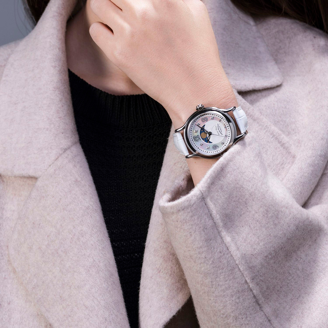 Корпус: Корпус из нержавеющей стали. Перламутровый циферблат часов украшен декоративным узором - гильоше и защищен практичным сапфировым стеклом устойчивым к механическим повреждениям. Диаметр 38.5 мм. Водозащита 30 м.