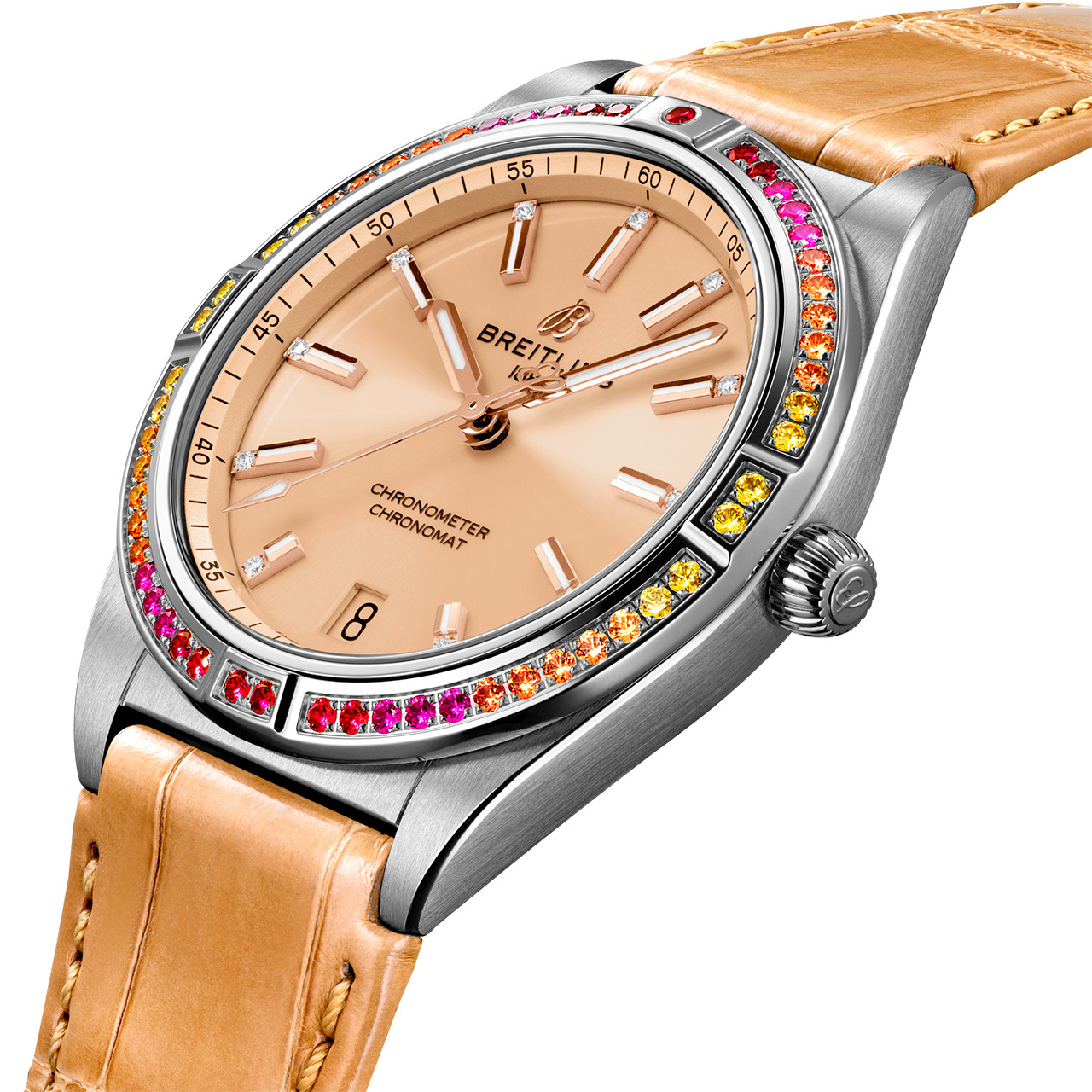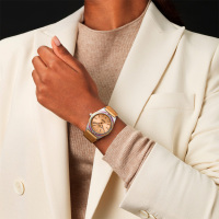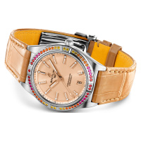 Корпус: Корпус выполнен из высококачественной стали с повышенной устойчивостью к коррозии. Лакированный циферблат медного цвета. Золотые индексы инкрустированы бриллиантами. Сапфировое стекло с антибликовым покрытием нанесенным с обеих сторон. Безель украшен драгоценными камнями. Диаметр корпуса составляет 36 мм. Водостойкость: 100 м.