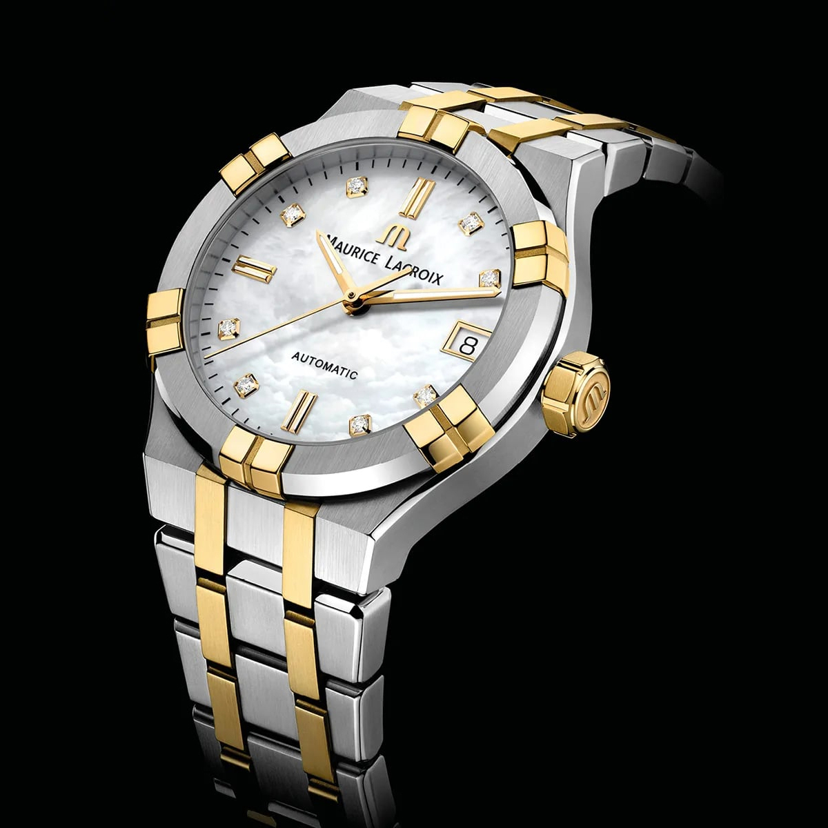 Корпус: Корпус из полированной/матовой стали 316L c частичным PVD - покрытием из желтого золота. Перламутровый циферблат украшен 8 бриллиантами. Стрелки и часовые индексы с покрытием, белое покрытие SLN Сапфировое стекло с антибликовым покрытием. Диаметр 35 мм. Водозащита 200 м.