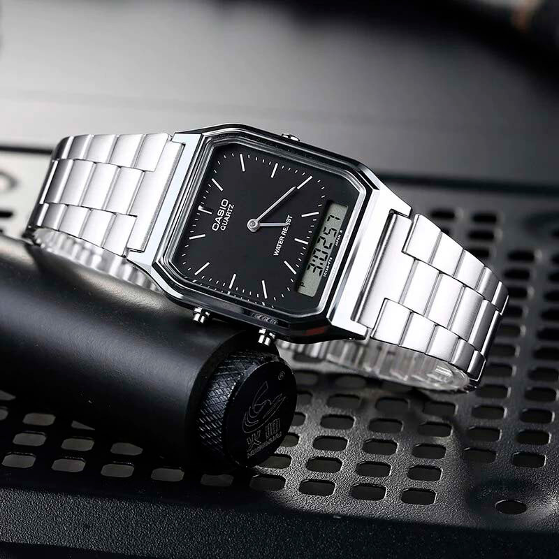 Корпус: Корпус часов выполнен из пластика с хромированным покрытием. Циферблат чёрного цвета вокруг дисплея. Дисплей серого цвета, цифры чёрного. Акриловое стекло. Габаритные размеры: 33x29x7 мм. Водозащита: 30м.