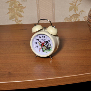 Материал и цвет: Корпус будильника изготовлен из пластика, к которому крепятся два металлических колокольчика, окрашенных в цвет корпуса. При звонке молоточек ударяет по колокольчикам. Стекло – минеральное.