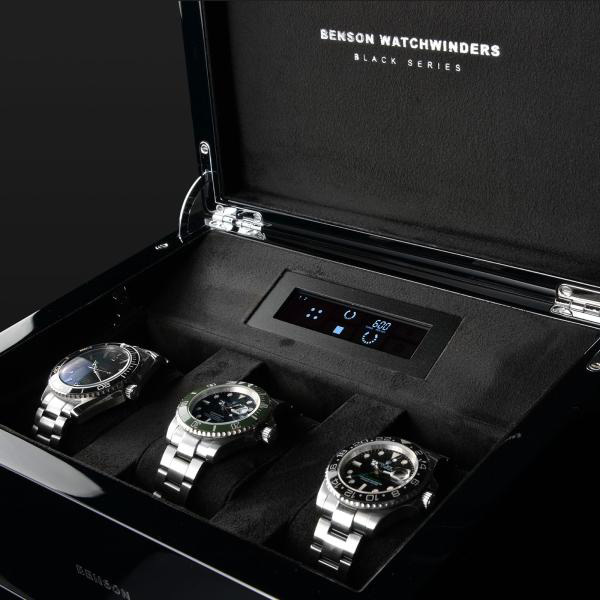 Материал: Корпус шкатулки оригинальной формы изготовлен из массива древесины твёрдых пород и оснащен смотровым окошком, которое позволяет смотреть на часы даже во время вращения. В верхней части корпуса находится ящичек, в котором могут дополнительно храниться до трёх экземпляров часов. Внутренняя светодиодная подсветка создает приятную атмосферу и позволяет любоваться часами даже в темноте.