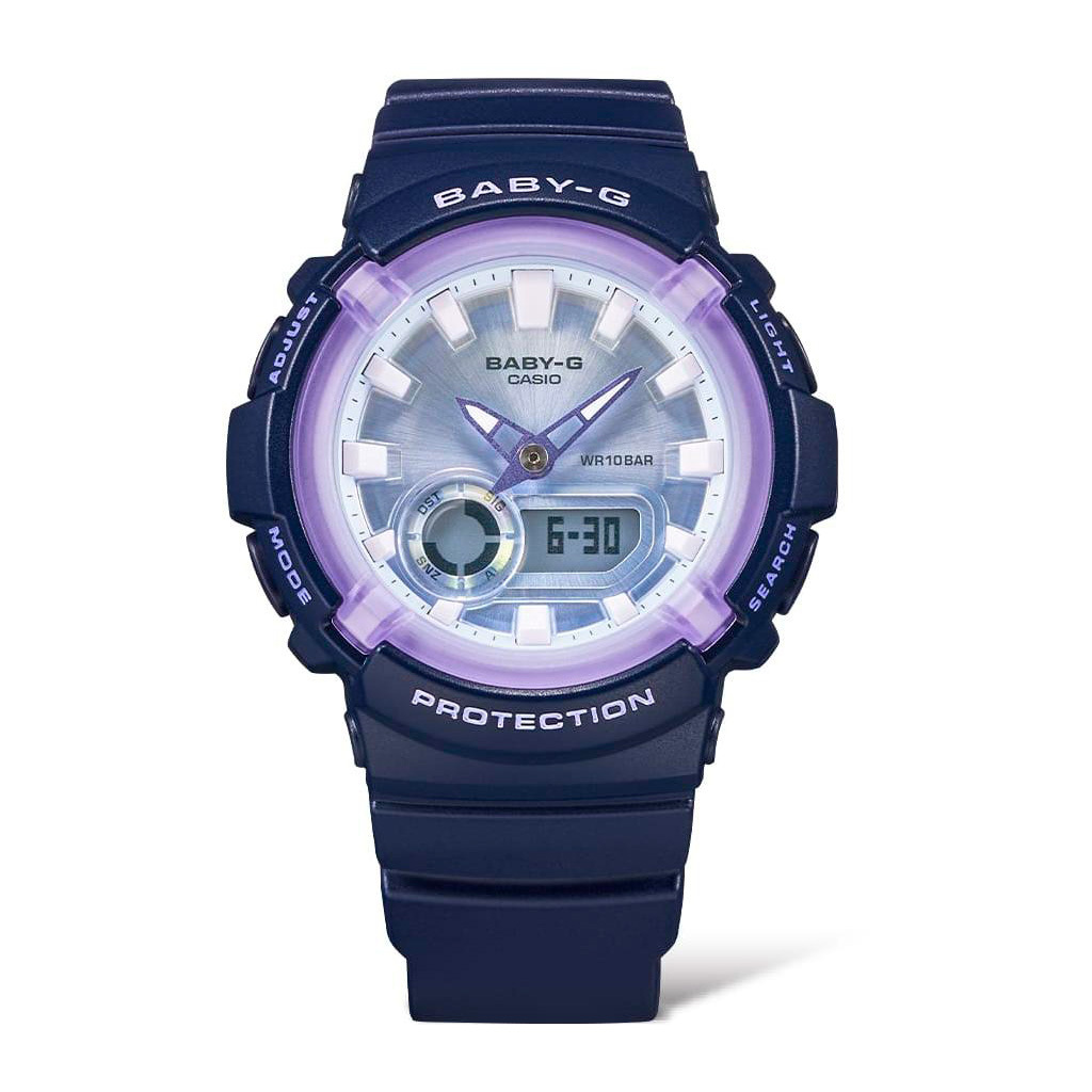 Корпус: Ударопрочный корпус выполнен из полимерного пластика фиолетового цвета. Необритовое светонакопительное покрытие обеспечивает длительное послесвечение в темноте даже после кратковременного нахождения на свету. Светодиодная лампа (Super Illuminator) выбираемая продолжительность освещения (1,5 секунды или 3 секунды), послесвечение. Прочное минеральное стекло. Размер корпуса (Д × Ш × В) 47,4 × 43,4 × 14,8 мм. Водонепроницаемость 100 метров.