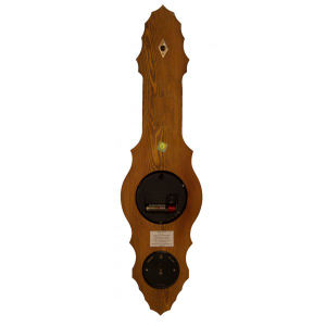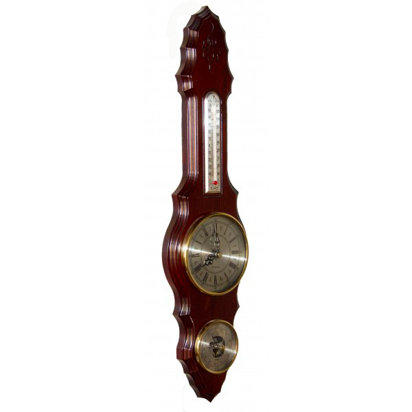 Описание: Метеостанция настенная: барометр, часы, гигрометр и термометр от российской компании "Бриг+", предназначена для измерения атмосферного давления, влажности в помещении, температуры в помещении. Корпус изготовлен из высококачественного массива дерева темно-коричневого цвета, а металлическая фурнитура изготавливается только из полнотелой латуни. Размер 140 x 515 x 70 мм. Использованы механизмы производства Германии, диаметр барометра 48 мм, часов 108 мм, длина термометра 125 мм.