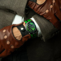 Ремешок: Ремешок зелёного цвета с чёрной полосой выполнен из натурального каучука, литая застежка - пряжка из нержавеющей стали с чернением. Дополнительно, в подарок, браслет-украшение на запястье.
