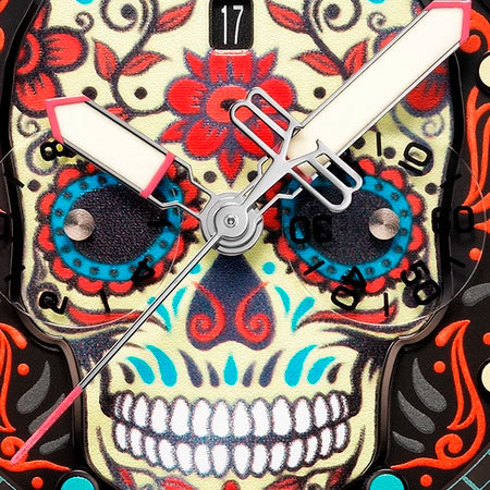 Корпус: Круглый корпус выполнен из нержавеющей стали марки 316L, с PVD покрытием черного цвета. Яркий и цветочный сахарный череп на циферблате. Фотолюминесцентное покрытие Super-Luminova® на индексах и стрелках добавляет остроты, обеспечивая при этом идеальную читаемость даже в самых темных условиях. Уникальный дизайн с завинчивающейся заводной головкой в положении «12 часов» и кнопок хронографа. Сапфировое стекло с антибликовым покрытием. Диаметр: 45 мм. Водозащита: 50 м.