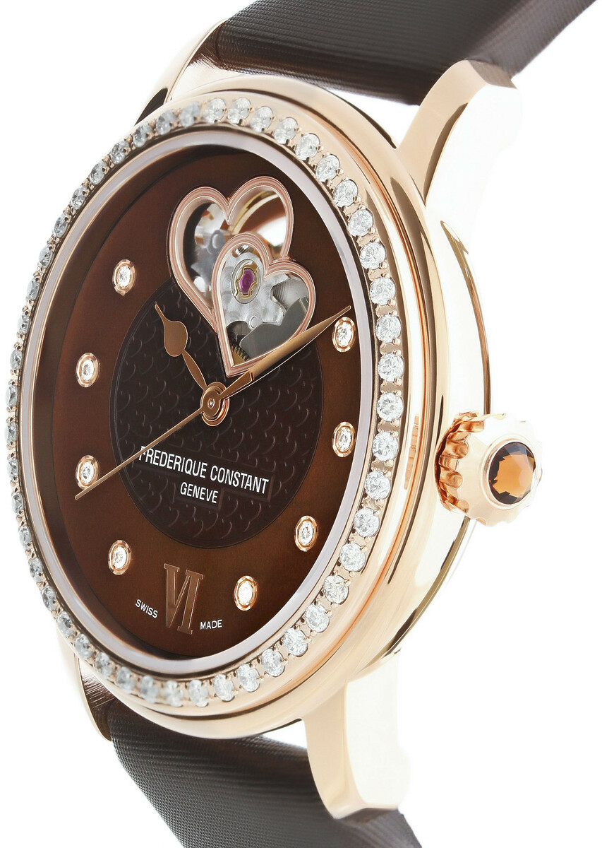 Корпус: Корпус из нержавеющей полированной/матовой стали c покрытием золота, украшен 56 бриллиантами. Циферблат коричневого цвета и искусно гильошированный узором в виде мелких сердец. Часовые метки украшены бриллиантами высокой чистоты. Стрелки часов и римская цифра изготовлены из полированного металла и покрыты розовым золотом. Сапфировое стекло. Диаметр 34 мм. Водостойкость 60 м.