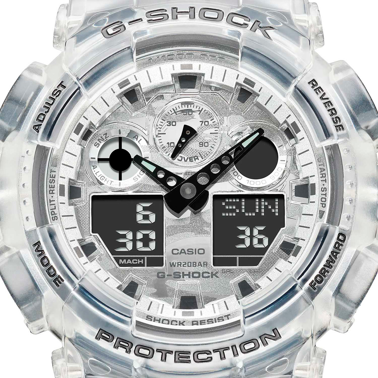 Корпус: Корпус часов изготовлен из прозрачного пластика с камуфляжным серым циферблатом. Метки в виде штрихов. Необритовое светонакопительное покрытие обеспечивает длительное послесвечение в темноте даже после кратковременного нахождения на свету. Минеральное стекло устойчиво к появлению царапин. Диаметр 51 мм. Водонепроницаемость 200 М.