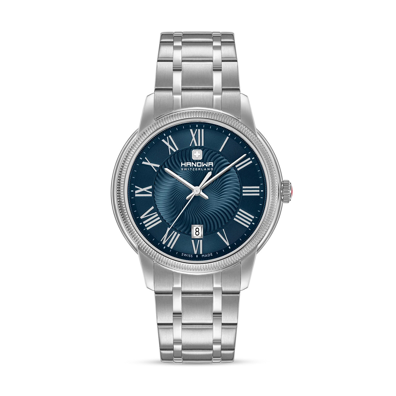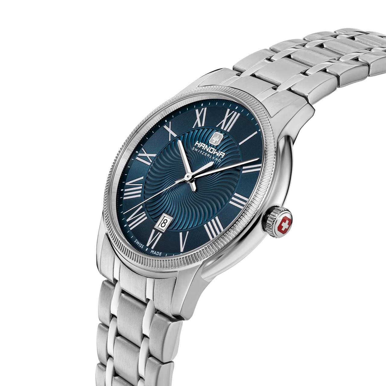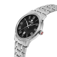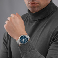 Корпус: Корпус выполнен из высококачественной стали с повышенной устойчивостью к коррозии. Серебристый циферблат защищен закаленным минеральным стеклом с сапфировым покрытием, обеспечивающим исключительную устойчивость к царапинам. Римские цифры черного цвета, стрелки выполненый из воронёной стали синего цвета. Диаметр корпуса: 44 мм. Водозащита до 50 метров позволит принимать душ или умываться, не снимая часов.