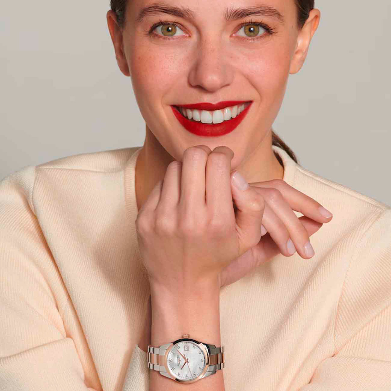 Корпус: Нержавеющая сталь марки 316L, поверхности с матовой шлифовкой сатинированием и глянцевой полировкой. Безель и заводная головка с PVD-покрытием цвета розового золота. Циферблат белый перламутровый циферблат декорирован 11 бриллиантами. Аппликация часовых индексов, а также стрелки с алмазной огранкой имеют золотое покрытие и полировку. Устойчивое к царапинам сапфировое стекло с многослойным антибликовым покрытием изнутри. Водонепроницаемость 50 метров. Диаметр 34 мм.