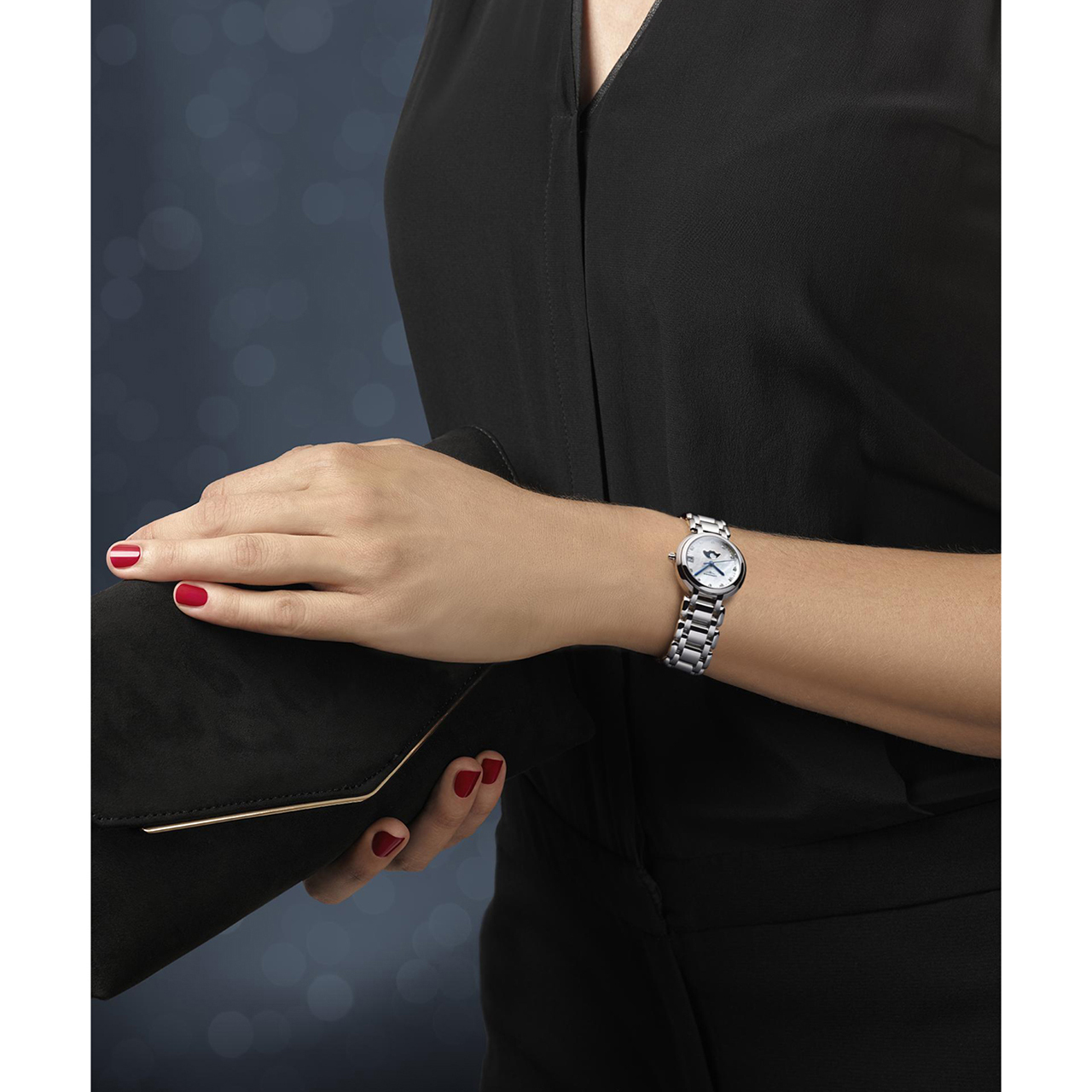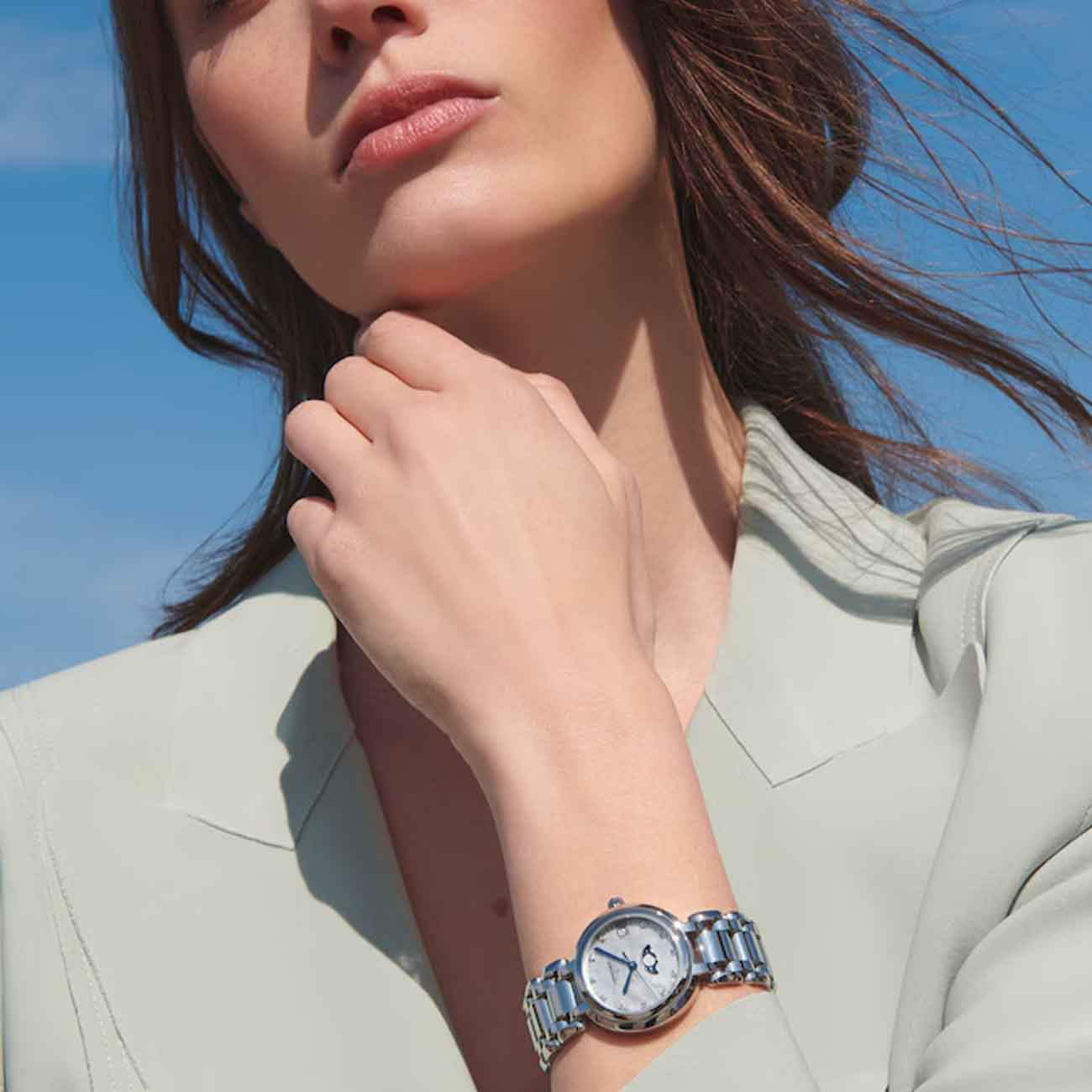 Корпус: Корпус и безель из матовой/полированной нержавеющей стали марки 316L. Перламутровый циферблат с 11 бриллиантами. Стальные, воронёные стрелки. Сапфировое стекло с антибликовым покрытием. Диаметр: 30.5 мм. Водонепроницаемость 30 м.