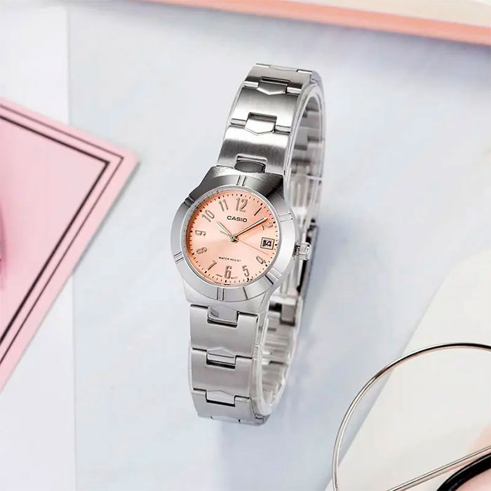 Корпус: Корпус изготовлен из гипоаллергенной латуни. Розовый циферблат с метками в виде арабских цифр. Прочное минеральное стекло обеспечит защиту часов от повреждений. Диаметр: 27 мм. Водонепроницаемость: 30 м.