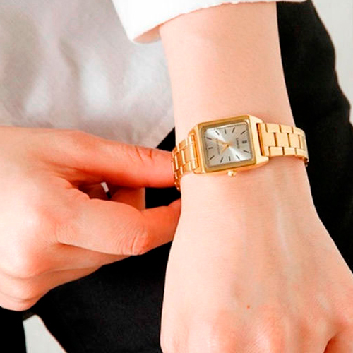 Корпус: Корпус часов выполнен из гипоаллергенной латуни с IP покрытием. Циферблат золотистого цвета с часовыми метками чёрного цвета. Стрелки выполнены из полированной стали c IP покрытием. Минеральное стекло защищает циферблат от повреждений. Габаритные размеры: 22х31мм, толщина 7,5мм, вес 51г. Водозащита: 3 ATM.