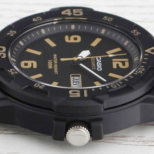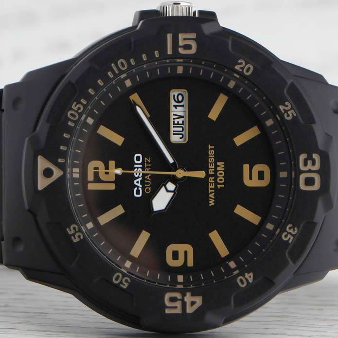 Корпус: Корпус изготовлен из полимерного пластика. Чёрный циферблат. Стрелки и цифры покрыты люминесцентным напылением (светятся в темноте). Пластиковое стекло обеспечит защиту часов от повреждений. Однонаправленный вращающийся безель. Диаметр 45 мм. Водонепроницаемость 100 м.
