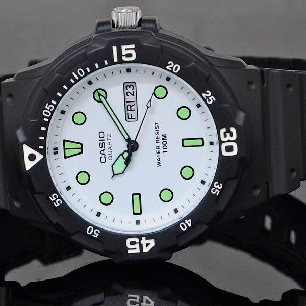Корпус: Корпус из высококачественного полимерного материала – прочного, легкого и долговечного. Вращающийся безель с яркой контрастной разметкой. Циферблат белого цвета с разметкой «милитари», крупные контрастные метки или цифры. Светонакопительное покрытие обеспечивает длительное послесвечение в темноте даже после кратковременного нахождения на свету. Выступы корпуса служат защитой для переводной коронки из нерж. стали. Задняя крышка соединяется с корпусом 4 винтами. Диаметр корпуса 44,6 мм, высота вместе с дужками – 47,9 мм, толщина 11,6 мм. Вес приблизительно 39 грамм. Водозащита до 100 метров (10 АТМ).
