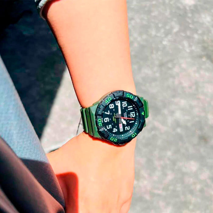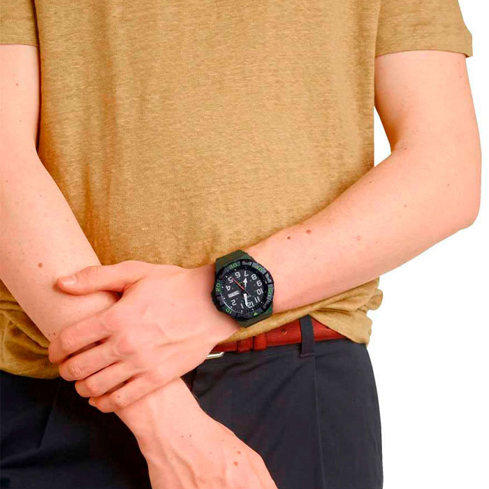 Корпус: Корпус изготовлен из полимерного пластика. Чёрный циферблат. Стрелки и цифры покрыты люминесцентным напылением. Необритовое светонакопительное покрытие обеспечивает длительное послесвечение в темноте даже после кратковременного нахождения на свету. Пластиковое стекло обеспечит защиту часов от повреждений. Однонаправленный вращающийся безель. Заводная головка с защитой. Стальная задняя крышка крепится на 4-х винтах. Диаметр 52 мм. Водонепроницаемость 100 м.