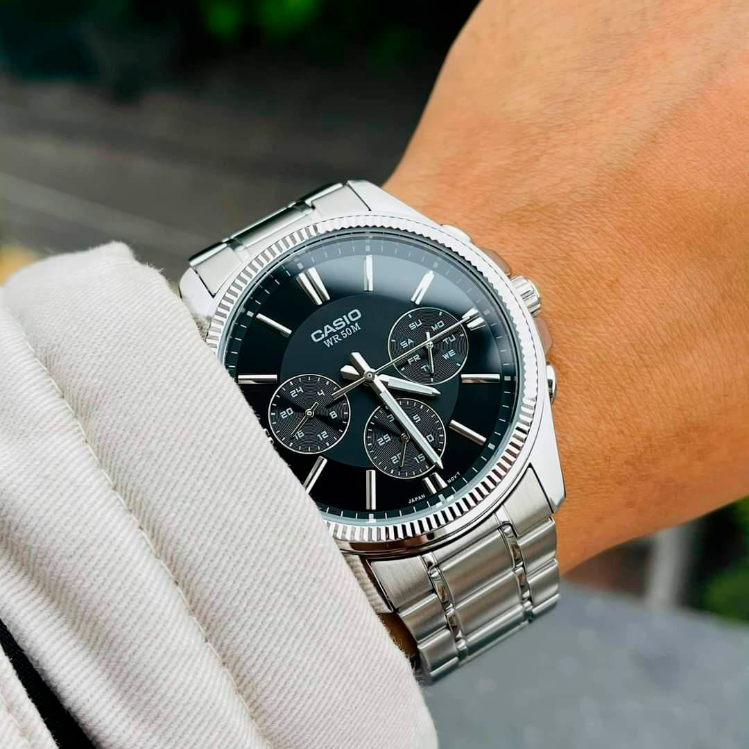 Корпус: Корпус из высококачественного стального сплава. Чёрный циферблат. Серебристые стрелки и часовые индексы. Минеральное стекло. Размер корпуса (Д × Ш × В) 48,5 × 42 × 9,7 мм. Водостойкость WR 50.