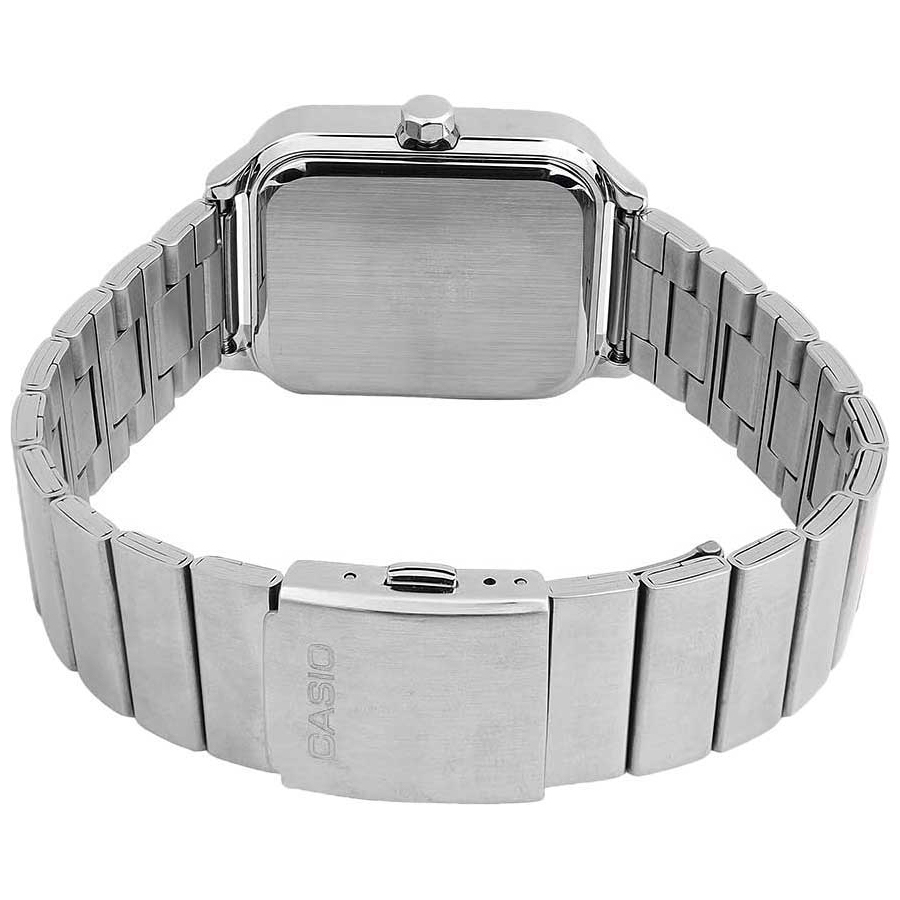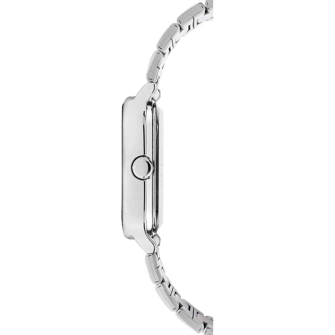 Корпус: Прямоугольный корпус хромированного цвета из нержавеющей стали. Циферблат серебристого цвета. Стрелки, метки в виде штрихов и арабской цифры синего цвета. Минеральное стекло защищает циферблат от повреждений. Габаритные размеры: 34х44,5мм, толщина 9,3мм. Водозащита: 5 ATM.