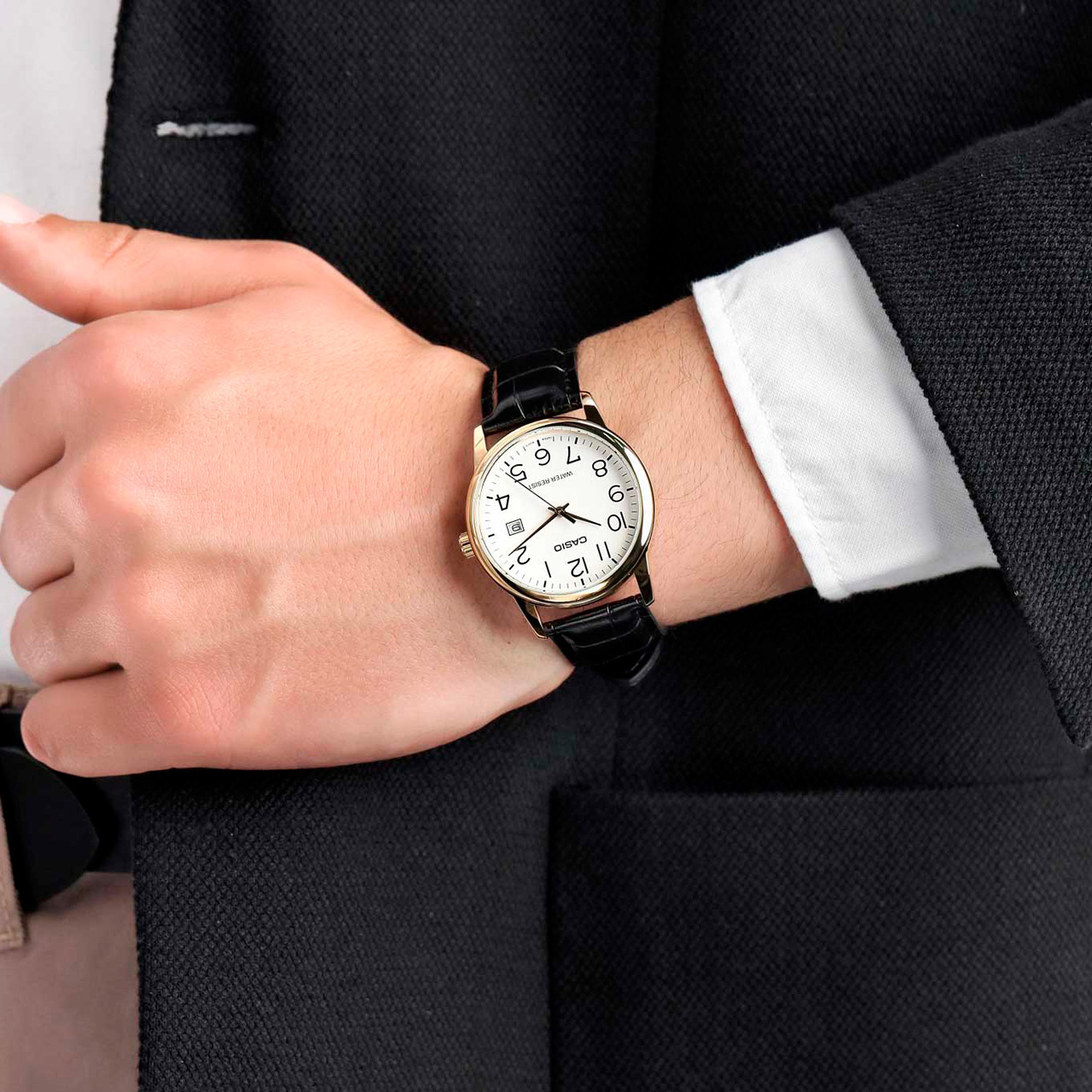 Ремешок: Кожаный ремешок чёрного цвета с классической застежкой.