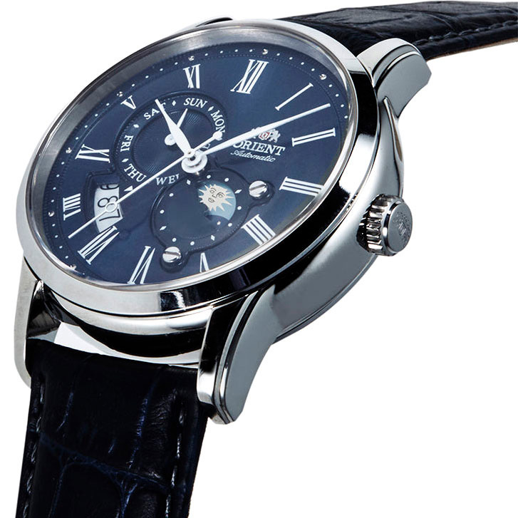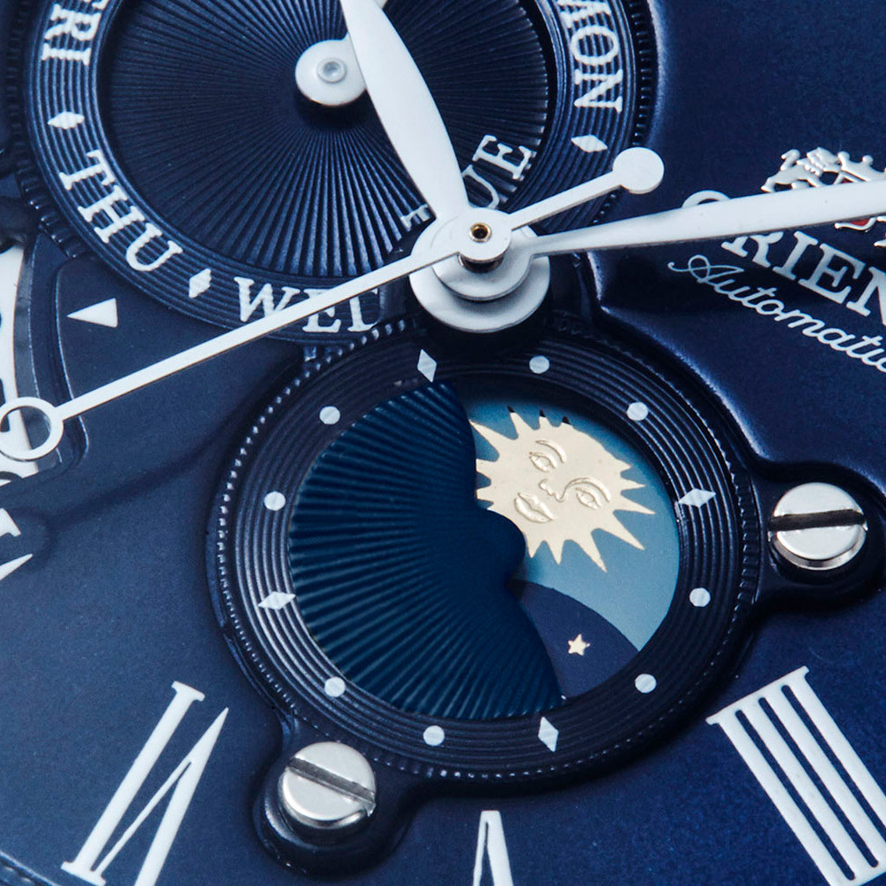 Функции: Центральные часовая, минутная и секундная стрелки.  День недели и индикатор день/ночь отображаются на отдельных циферблатах. Окошко даты находится в положении 8 часов.