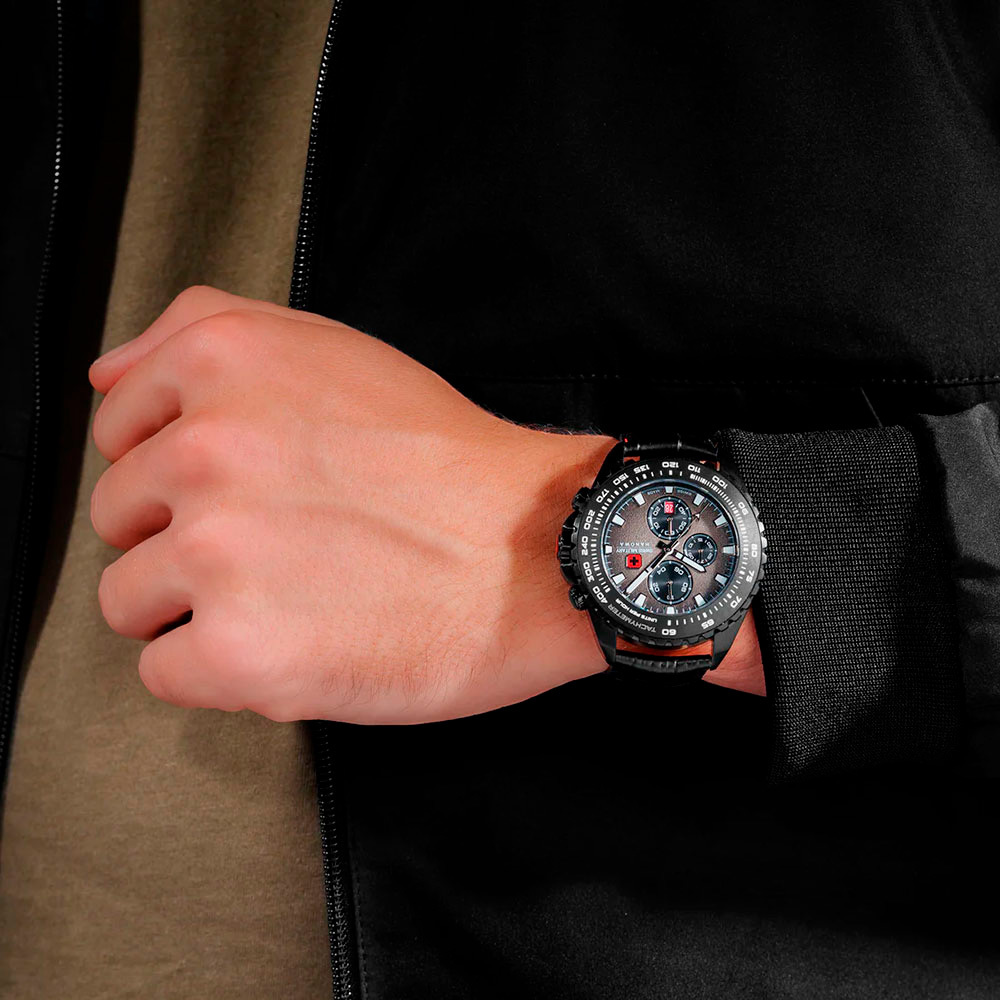 Корпус: Круглый корпус выполнен из нержавеющей стали с черным PVD покрытием. Серый циферблат. Люминесцентные стрелки и метки. Устойчивое к возникновению царапин сапфировое стекло. Заводная головка с защитой. Диаметр корпуса составляет 45 мм. Водостойкость WR 100.