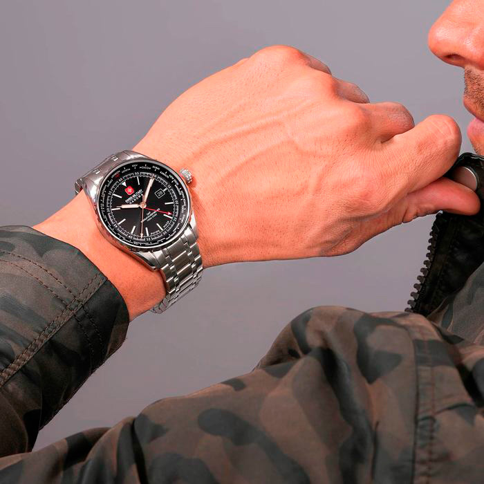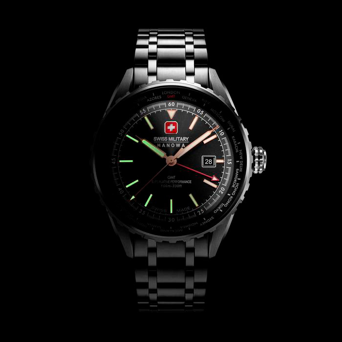 Корпус: Круглый корпус выполнен из нержавеющей стали 316. Рифленый безель. Циферблат чёрного цвета выполнен по технологии Sunray (солнечные лучи) и защищен прочным сапфировым стеклом. По краю циферблата нанесена минутная шкала и названия мировых городов для отслеживания времени в других часовых поясах. Стрелки и метки с люминесцентным покрытием, которое светится в темноте после непродолжительной зарядки на свету. Рифленая заводная головка украшена фирменным логотипом. Диаметр 44 мм. Водонепроницаемость 100 м.