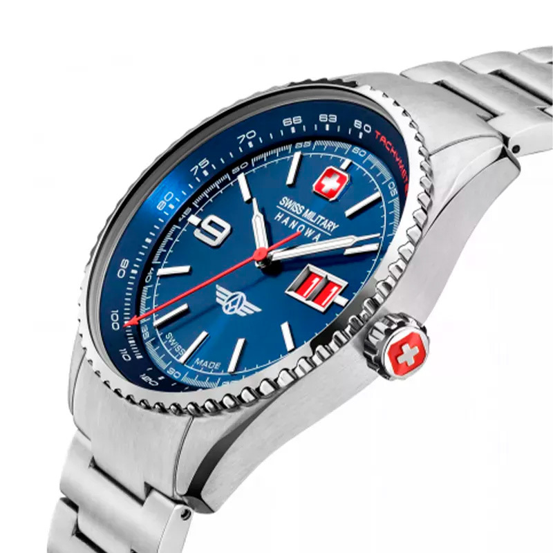 Корпус: Круглый корпус изготовлен из нержавеющей стали. Синий циферблат выполнен по технологии Sunray (солнечные лучи), защищенный высокопрочным сапфировым стеклом, украшен фирменным логотипом Swiss Military Hanowa в положении 12 часов. Стрелки и метки в виде штрихов и арабской цифры с нанесенным люминесцентным составом, который светится в темноте. Вращающийся рифленый безель. Рифленая заводная головка. Завинчивающаяся задняя крышка. Диаметр: 42 мм. Водозащита: 100 м.