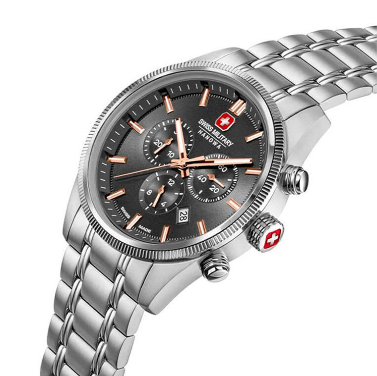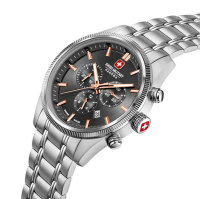 Корпус: Круглый стальной корпус. Рифленый безель. Циферблат чёрного цвета выполнен по технологии Sunray (солнечные лучи) и защищен прочным сапфировым стеклом. Метки золотистого цвета в виде штрихов, фирменный логотип Swiss Military Hanowa в положении 12 часов. Стрелки и метки с люминесцентным покрытием, которое светится в темноте после непродолжительной зарядки на свету. Заводная головка украшена фирменным логотипом. Задняя крышка имеет винтовое соединение с корпусом. Диаметр корпуса составляет 43 мм. Водостойкость: 100 метров (10 АТМ).