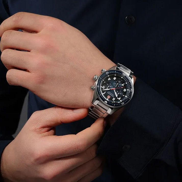 Корпус: Круглый корпус из нержавеющей стали. Вращающийся в одном направлении рифленый безель с минутной шкалой. Безель с IP - покрытием синего цвета с ударопрочным верхним кольцом из минерального стекла K1 для дополнительной защиты. Циферблат синего цвета. Накладные часовые метки в виде арабских цифр и точек. Стрелки и метки с люминесцентным покрытием SuperLumiNova, которое светится в темноте. Сапфировое стекло устойчивое к появлению царапин, обладающее высокой прозрачностью. Рифленая заводная головка. Диаметр: 43 мм. Водозащита: 100 м.