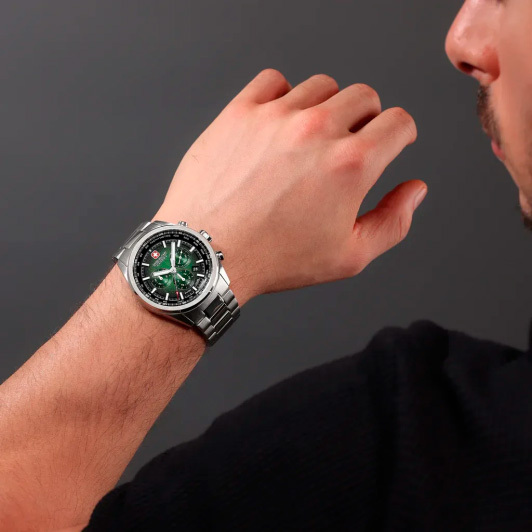 Корпус: Корпус выполнен из высококачественной нержавеющей стали 316L с полировкой и матовой шлифовкой - сатинированием. Градиентный циферблат (зелёный/чёрный). Стрелки и часовые индексы с люминесцентным покрытием, которое светится в темноте после непродолжительной зарядки на свету. Сапфировое стекло устойчивое к появлению царапин, обладающее высокой прозрачностью. Диаметр: 43 мм. Водонепроницаемость: 100 м.