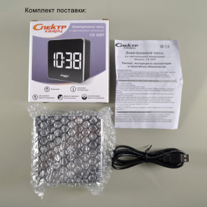 Механизм: Кварцевый будильник с термометром и цифровой индикацией. Данная модель работает от сети 220В (адаптер не входит в комплект, шнур USB длиной 1 метр в комплекте). Цифровая индикация светится (видно в темноте). Имеется резервное питание от батареек тип R6(AA) x 3 шт. (не входят в комплект), используется для сохранения настроек времени и срабатывания будильника на случай отключения электричества. Функциональность: ежедневный будильник, отображение времени в 12 или 24 часовом формате, регулировка яркости индикации (3 ступени, также имеется возможность полностью отключить свечение дисплея), ночной режим яркости (при настроенном ночном режиме, в установленный промежуток времени яркость индикации дисплея автоматически будет установлена на минимальный уровень), термометр с возможностью индикации температуры в градусах Цельсия (°C) или Фаренгейтах (°F). Часы могут работать, в том числе, только от батареек, т.е. без подключения к внешнему источнику питания. Когда часы работают только от батареек, дисплей всё время выключен, при этом нажатие любой кнопки или кратковременное нажатие на корпус часов сверху включит индикацию примерно на 10 секунд. Питание осуществляется от порта USB. В комплекте с часами идёт USB шнур (1,5 метра) для питания часов от USB источника (5V). Для питания можно использовать, например, любой адаптер, предназначенный для зарядки мобильных телефонов, и имеющий USB выход. Блока питания от сети 220V в комплекте нет.
