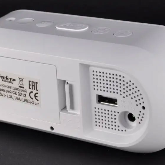 Механизм: Часы настольные с цифровой индикацией с будильником и измерением температуры. Яркость свечения часов можно менять (три уровня яркости) или полностью отключить индикацию. В режиме выключенной индикации нажатие любой кнопки кратковременно включит индикацию. Также у часов есть ночной режим работы индикации, который позволяет автоматически снизить яркость свечения в тёмное время суток. При включённом ночном режиме, в настроенный промежуток времени яркость индикации дисплея автоматически будет установлена на минимальный уровень. Часы могут работать в трёх режимах: отображение текущего времени, отображение температуры окружающего воздуха и режим попеременного отображения времени и температуры. Две центральные точки на дисплее часов не мигают. Часы могут работать, в том числе, только от батареек, т.е. без подключения к внешнему источнику питания. Когда часы работают только от батареек, дисплей всё время выключен, при этом нажатие любой кнопки или кратковременное нажатие на корпус часов сверху включит индикацию примерно на 10 секунд. У часов есть один будильник. Температура может показываться в градусах Цельсия или в градусах Фаренгейта. Питание осуществляется от порта USB. В комплекте с часами идёт USB шнур (1,5 метра) для питания часов от USB источника (5V). Для питания можно использовать, например, любой адаптер, предназначенный для зарядки мобильных телефонов, и имеющий USB выход. Блока питания от сети 220V в комплекте нет.