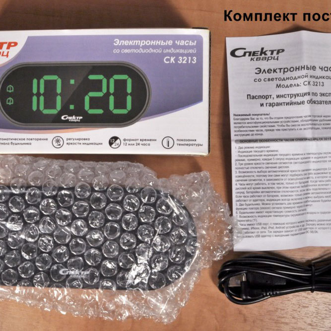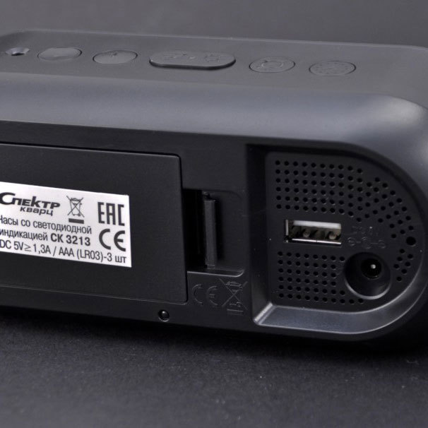 Механизм: Часы настольные с цифровой индикацией с будильником и измерением температуры. Яркость свечения часов можно менять (три уровня яркости) или полностью отключить индикацию. В режиме выключенной индикации нажатие любой кнопки кратковременно включит индикацию. Также у часов есть ночной режим работы индикации, который позволяет автоматически снизить яркость свечения в тёмное время суток. При включённом ночном режиме, в настроенный промежуток времени яркость индикации дисплея автоматически будет установлена на минимальный уровень. Часы могут работать в трёх режимах: отображение текущего времени, отображение температуры окружающего воздуха и режим попеременного отображения времени и температуры. Две центральные точки на дисплее часов не мигают. Часы могут работать, в том числе, только от батареек, т.е. без подключения к внешнему источнику питания. Когда часы работают только от батареек, дисплей всё время выключен, при этом нажатие любой кнопки или кратковременное нажатие на корпус часов сверху включит индикацию примерно на 10 секунд. У часов есть один будильник. Температура может показываться в градусах Цельсия или в градусах Фаренгейта. Питание осуществляется от порта USB. В комплекте с часами идёт USB шнур (1,5 метра) для питания часов от USB источника (5V). Для питания можно использовать, например, любой адаптер, предназначенный для зарядки мобильных телефонов, и имеющий USB выход. Блока питания от сети 220V в комплекте нет.