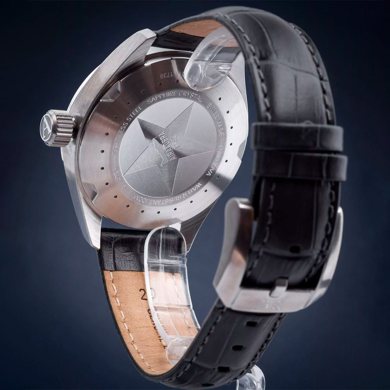Корпус: Нержавеющая сталь. Циферблат серый, стрелки и часовые индексы с люминесцентным покрытием. Своей матовой зернистой отделкой циферблат часов напоминает приборы из кабины пилота. Лаконичные, высококонтрастные стрелки и часовые метки обеспечивают превосходную четкость и читаемость изображения. Диаметр 42 мм. Сапфировое стекло с антибликовым покрытием. Задняя крышка имеет резьбовое соединение с корпусом. Переводная коронка с двойным уплотнителем и винтовой фиксацией для дополнительной защиты от попадания воды. Водозащита 100 метров. На крышке изображение самого самолета и военная звезда как дань почтения истребителю времен Второй мировой войны.