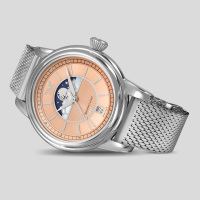 Корпус: Корпус выполнен из нержавеющей стали 316L, поверхности с полировкой до зеркального блеска. Бежевый циферблат с часовыми индексами в виде штрихов. Облака на циферблате украшены перламутровыми вставками. Стрелки и метки с люминесцентным покрытием. Устойчивое к возникновению мелких механических повреждений сапфировое стекло с антибликовым покрытием. Задняя крышка украшена гравировкой. Рифленая заводная головка с двойной прокладкой. Диаметр корпуса: 36 мм. Водостойкость: WR 100.
