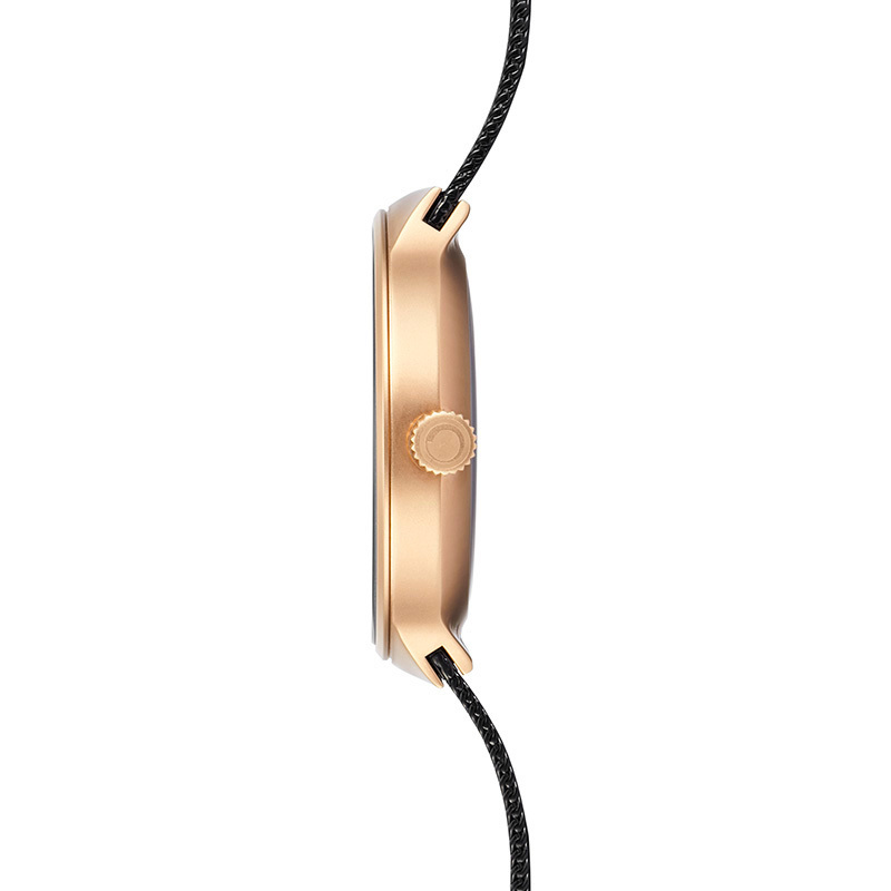 Корпус: Круглый корпус выполнен из матовой нержавеющей стали 316L с IP покрытием цвета розового золота. Чёрный циферблат с золотистыми стрелками. Минеральное стекло. Диаметр 43 мм. Водозащита 30 метров.