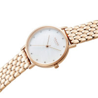 Корпус: Круглый корпус выполнен из нержавеющей стали. Перламутровый циферблат украшен кристаллами. Устойчивое к возникновению мелких механических повреждений минеральное стекло. Размер корпуса составляет 32 мм. Водостойкость WR 30 (брызги).