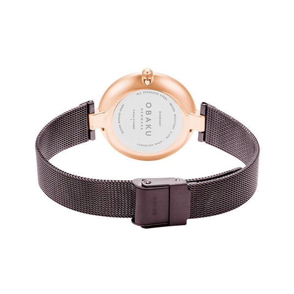 Корпус: Корпус из частично сатинированной стали с IP покрытием цвета розового золота. Тёмный циферблат с золотистыми стрелками декорирован бриллиантом. Минеральное стекло. Диаметр 36 мм. Водозащита 30 метров.