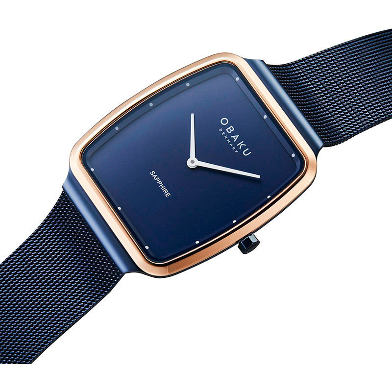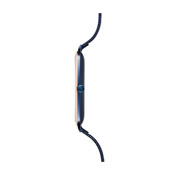 Корпус: Корпус выполнен из нержавеющей стали с IP покрытием цвета розового золота и синего. Синий циферблат. Стрелки и часовые индексы белого цвета. Устойчивое к возникновению царапин сапфировое стекло. Размер корпуса составляет 34х43 мм, толщина 4,8 мм. Водостойкость WR 30 (брызги).