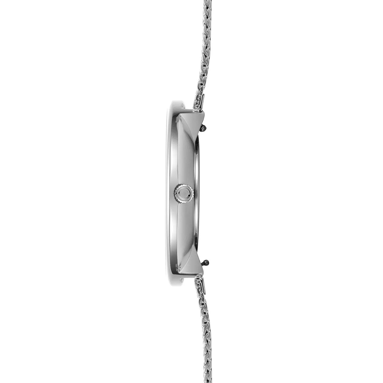 Корпус: Круглый корпус выполнен из нержавеющей стали. Белый перламутровый циферблат украшен кристаллами. Прочное минеральное стекло устойчивое к мелким механическим повреждениям. Диаметр корпуса составляет: 36 мм. Водостойкость: WR 30м.